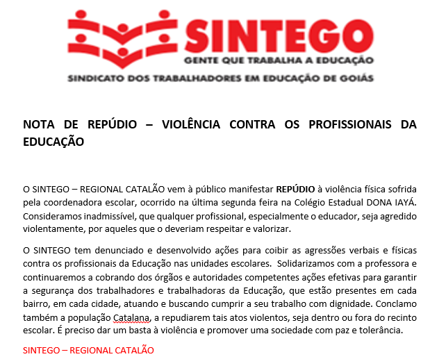 O Sindicato dos Trabalhadores em Educação de Goiás (SINTEGO), está convidado a todos os professores e profissionais administrativos das redes estaduais e municipais e a população em geral da cidade de Catalão, para um ato público contra a violência nas escolas.