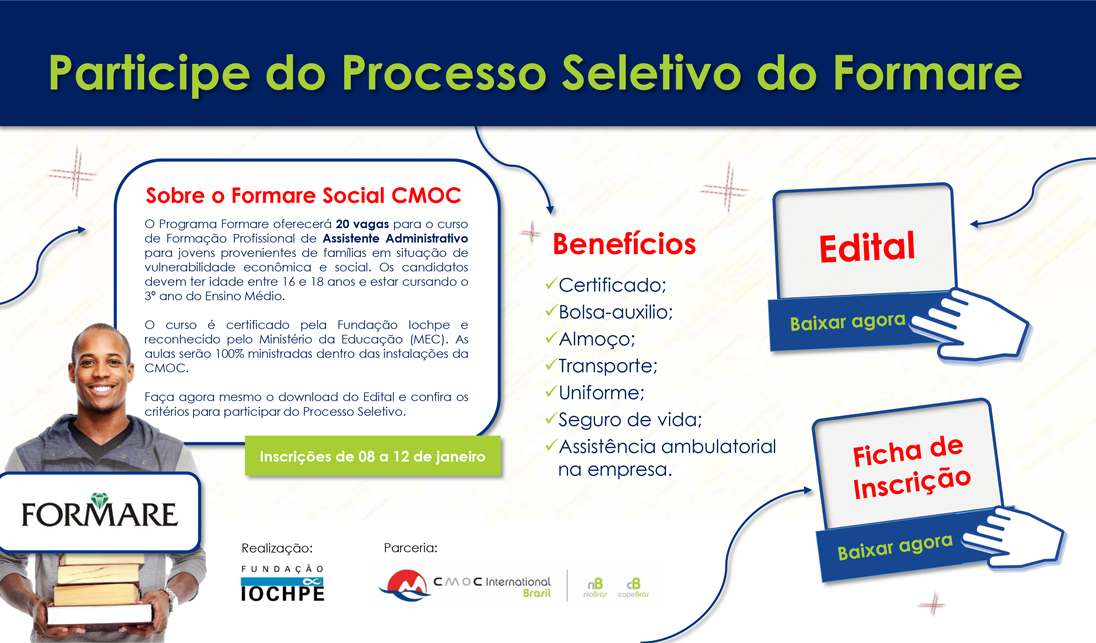 Na próxima segunda-feira, dia 8, serão abertas as inscrições gratuitas para o processo seletivo do curso de Assistente Administrativo do Formare, programa da Fundação Iochpe de qualificação profissional para jovens, apoiado pela CMOC International Brasil. Podem se inscrever estudantes de escolas públicas de Catalão (GO), com idade entre 16 e 18 anos, que estejam cursando o terceiro ano do ensino médio. Nessa primeira edição, o Formare CMOC vai qualificar 20 pessoas.