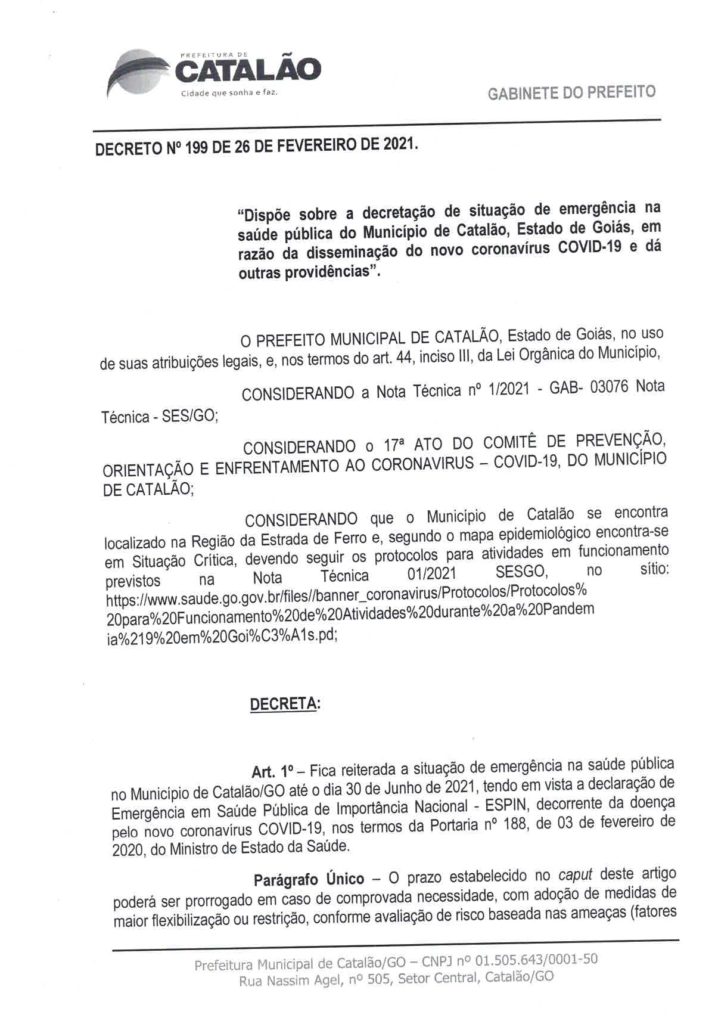 Em atendimento ao 17º Ato do Comitê de Prevenção, Orientação e Enfrentamento ao Coronavírus e considerando a nota técnica nº 01/2021 – SES/GO, e também que o município de Catalão se encontra localizado na Região da Estrada de Ferro, onde de acordo com o mapa epidemiológico emitido pelo Governo Estadual, encontra-se em Situação Crítica, foi assinado na tarde desta sexta-feira (26), o decreto de nº 0199/2021, que dispõe sobre a situação de emergência na saúde pública do município de Catalão em virtude da COVID-19.