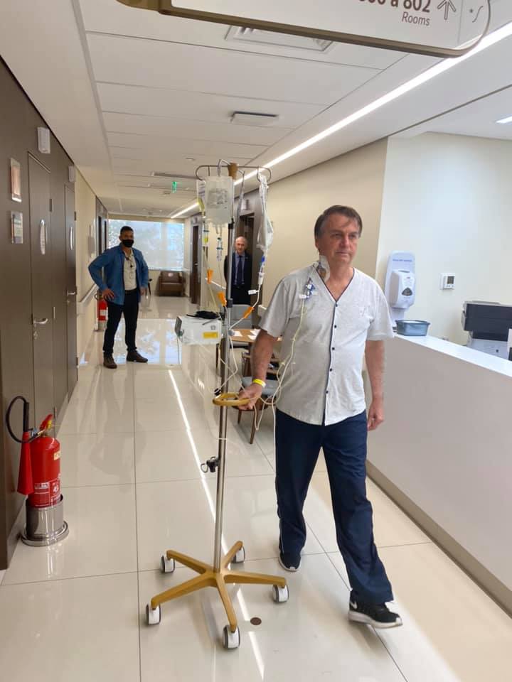 Pela manhã, Bolsonaro havia divulgado uma foto em seu Instagram na qual aparece caminhando no corredor do hospital segurando o suporte para soro. “Em breve de volta a campo, se Deus quiser!”, escreveu na legenda da imagem.