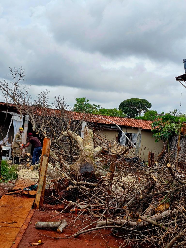 A primeira chamada ocorreu por volta das 9h45. Uma mangueira seca caiu sobre uma casa na Rua 29, Quadra 38, Lote 10, atingindo a área de serviço e causando danos à estrutura. Assim, a equipe utilizou motosserras a bateria e a combustão para cortar toda a árvore.