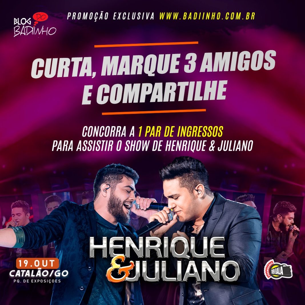 Em parceria com empresa Trem Bala Promoções o Blog do Badiinho está sorteando um par de ingressos para o show da dupla Henrique e Juliano em Catalão, no Parque de Exposiçao de Catalão, na próxima sexta-feira, 19 de outubro. Lembrando que a promoção está Fan Page oficial do Blog do Badiinho. Para concorrer você deve curtir a página e seguir as instruções descritas no banner promocional que está afixado no tópico da nossa fan page.