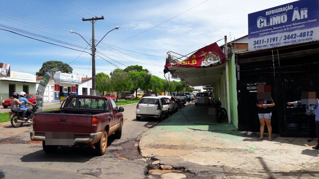 “Ao desviarem de buraco, caminhão e ônibus danificaram a faixada de comerciante”