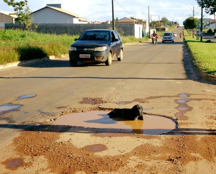 O cãozinho da imagem acima é uma das fotos mais curtidas, compartilhadas e comentadas nas redes sociais. A foto divulgada mostra o cão se maravilhando e com uma carinha de animação se banhando nas águas de um buraco que se transformou em uma verdadeira banheira, Avenida José Marcelino, no Bairro Castelo Branco.
