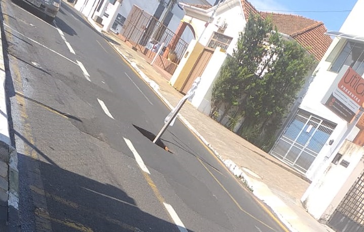 Uma trabalhadora do setor central de Catalão, que também é uma de nossas leitoras e seguidora do nosso trabalho, enviou duas fotografias que mostram uma cratera na Rua Bernardo Guimaraes, no Centro da cidade, bem acima da Drogaria Felicidade.