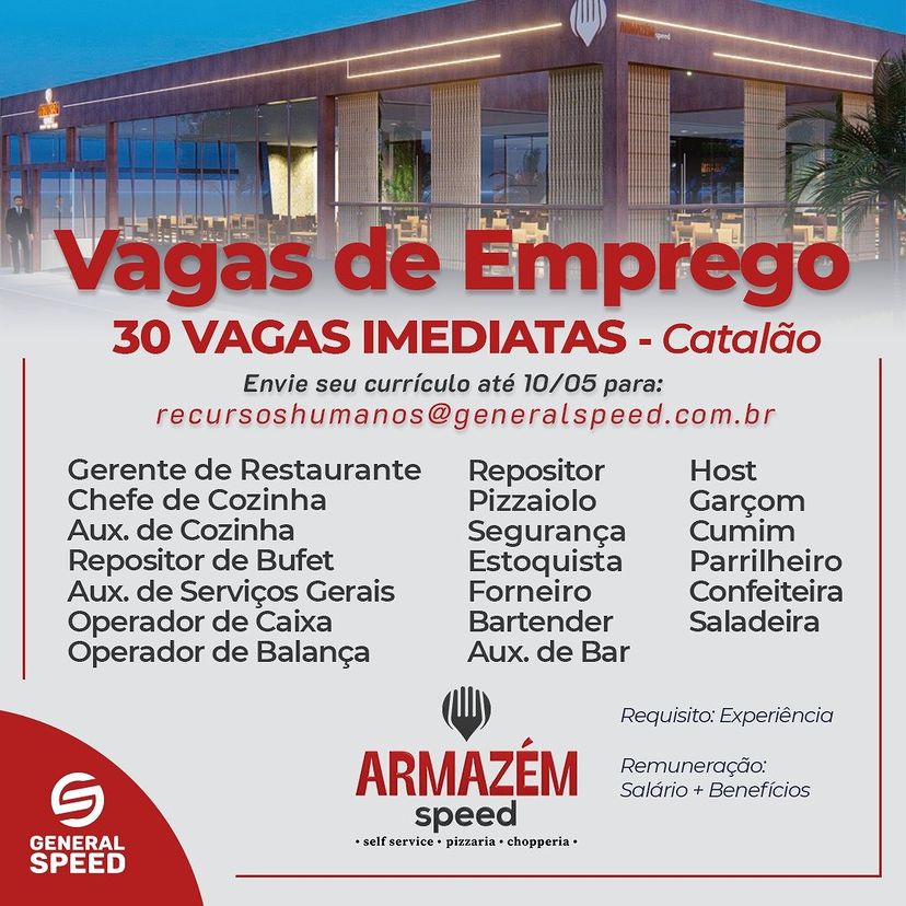 A rede de bares Speed Jack que está prestes a inaugurar seu terceiro empreendimento na cidade, o Armazém Speed, Restaurante, Chopperia, Churrascaria e Pizzaria, na Rua Vereador Kaveffes Abrão, em frente ao Parque Calixto Abrão, no centro de Catalão, está com 30 vagas de trabalho abertas com contratação imediata.