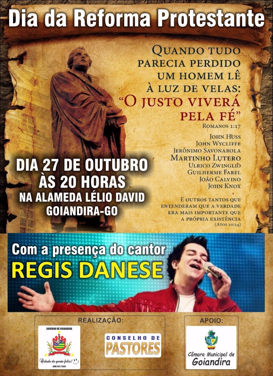A Prefeitura de Goiandira e o Conselho de Pastores, com o apoio da Câmara Municipal da cidade da terra branca, realizará neste próximo sábado (27), às 20h, na Avenida Lélio David, os 500 anos da Reforma Protestante, com a participação do cantor gospel Regis Danese.