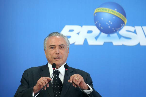 Temer chegou ao salão onde fez o pronunciamento, no Palácio do Planalto, acompanhado dos ministros da Justiça, Alexandre de Moraes, das Relações Exteriores, José Serra, e da Advogada-Geral da União, Grace Mendonça.