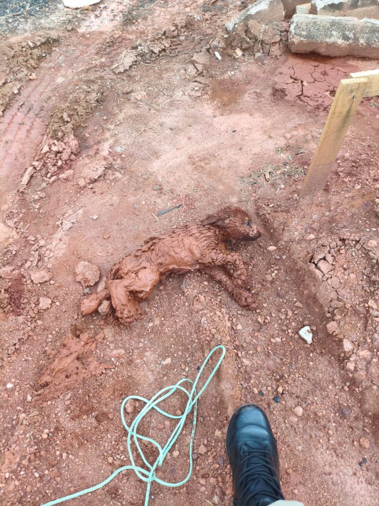 A ocorrência foi registrada por volta das 17h32, na Rua C-06, onde o animal havia caído em um buraco de aproximadamente cinco metros de profundidade, utilizado para a fundação de uma construção.