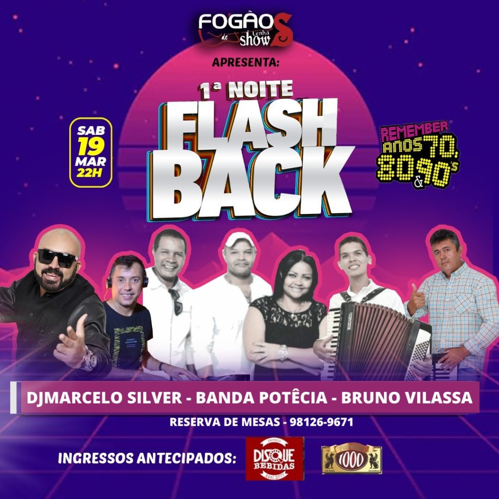 Hoje, sabadão, 19 de março, o Fogão de Lenha Show vai realizar um evento para você viajar no tempo. A 1ª Noite Flash Back vai fazer você relembrar sucessos que marcaram os 70, 80 e 90, com shows da Banda Potência, Bruno Vilassa e DJ Marcelo Silver.