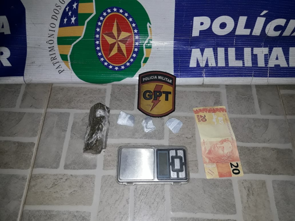 Durante abordagem policial, a equipe abordou o menor com drogas (maconha) no bairro Estrela e, em sua casa, foram encontradas mais drogas (maconha), balança de precisão e uma nota de R$ 20,00, aparentemente falsa.