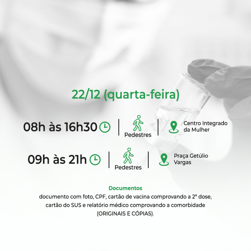 É necessário levar documento com foto, CPF, cartão de vacina comprovando a 2ª dose, cartão do SUS e relatório médico comprovando a comorbidade (ORIGINAIS E CÓPIAS).