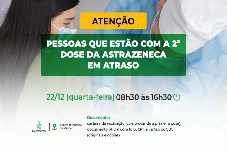 É OBRIGATÓRIO levar carteira de vacinação (comprovando a primeira dose), documento oficial com foto, CPF e cartão do SUS. Todos ORIGINAIS E CÓPIAS.