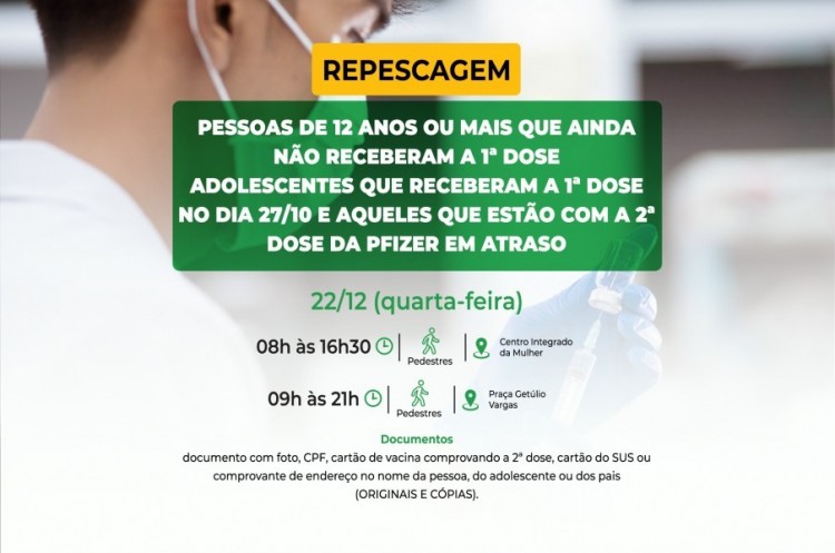 É necessário levar documento com foto, CPF, cartão de vacina comprovando a 2ª dose, cartão do SUS ou comprovante de endereço no nome da pessoa, do adolescente ou dos pais (ORIGINAIS E CÓPIAS).