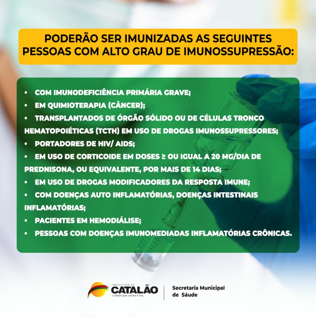 A Prefeitura de Catalão, por meio da Secretaria Municipal de Saúde/Núcleo de Vigilância Epidemiológica, convoca as pessoas com alto grau de imunossupressão, que receberam a segunda dose da vacina contra a covid-19 há mais de 28 dias, para aplicação da terceira dose. E também convoca os adultos que receberam a segunda dose até o dia 11 de agosto.
