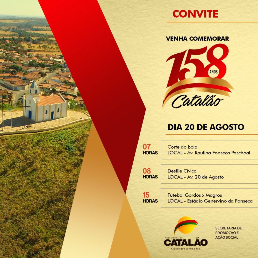 A Prefeitura Municipal de Catalão convida a toda a população catalana para comemorar o aniversário da cidade, no domingo (20). São 158 anos de história.