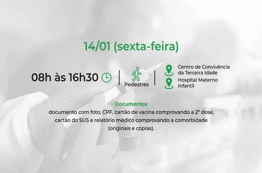 É necessário levar documento com foto, CPF, cartão de vacina comprovando a 2ª dose, cartão do SUS e relatório médico comprovando a comorbidade (originais e cópias).