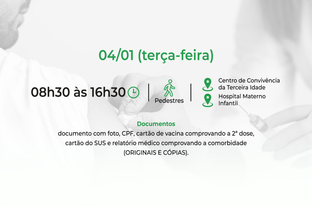 É necessário levar documento com foto, CPF, cartão de vacina comprovando a 2ª dose, cartão do SUS e relatório médico comprovando a comorbidade (ORIGINAIS E CÓPIAS).