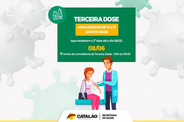 A Prefeitura de Catalão, por meio da Secretaria Municipal de Saúde/Núcleo de Vigilância Epidemiológica, convoca adolescente de 12 a 17 anos que receberam a segunda dose da vacina contra a Covid-19 até o dia 08 de fevereiro, para aplicação da terceira dose.