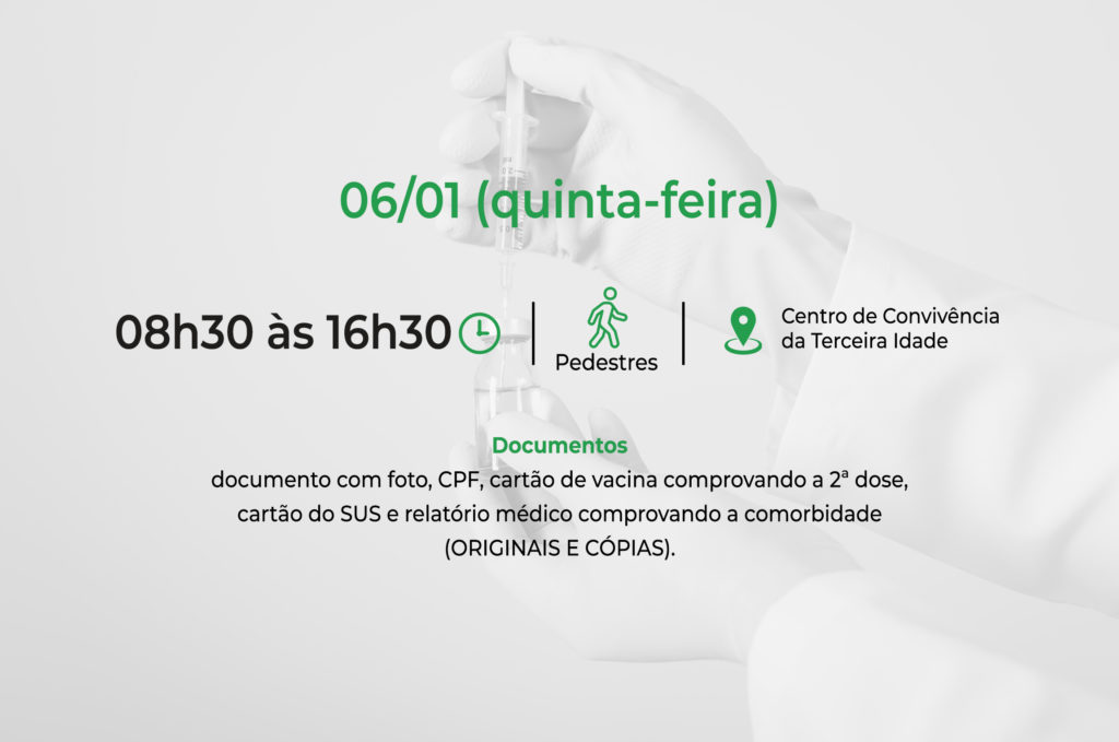 É necessário levar documento com foto, CPF, cartão de vacina comprovando a 2ª dose, cartão do SUS e relatório médico comprovando a comorbidade (ORIGINAIS E CÓPIAS).