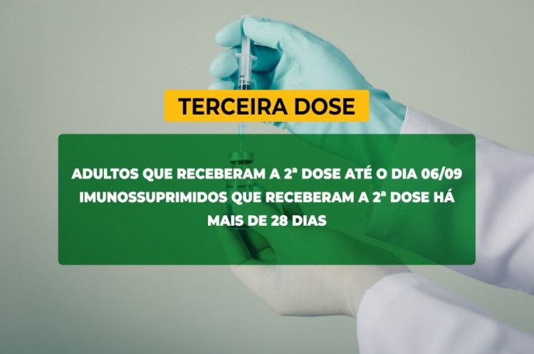 A Prefeitura de Catalão, por meio da Secretaria Municipal de Saúde/Núcleo de Vigilância Epidemiológica, convoca as pessoas com alto grau de imunossupressão, que receberam a segunda dose da vacina contra a covid-19 há mais de 28 dias, para aplicação da terceira dose. E também convoca os adultos que receberam a segunda dose até o dia 06 de setembro.