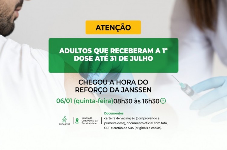 Pessoas que ainda não receberam a segunda dose da vacina contra a covid-19 (Janssen): a Prefeitura de Catalão, por meio da Secretaria Municipal de Saúde, convoca para a aplicação do reforço do imunizante. O chamado é para quem tomou a primeira dose até o dia 31 de Julho.