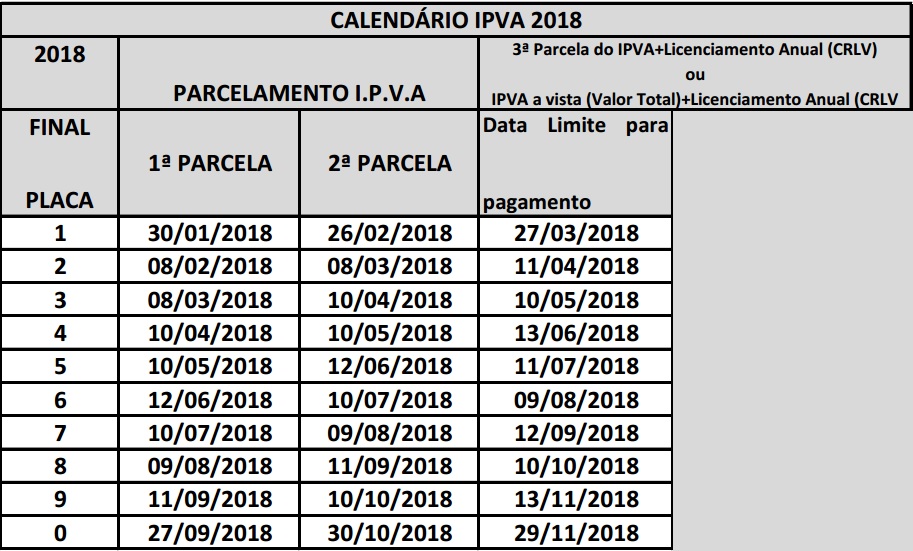 A Secretaria de Estado da Fazenda de Goiás divulgou nesta quarta-feira, dia 22, o calendário de pagamento do Imposto sobre a Propriedade de Veículos Automotores (IPVA) para 2018. A tabela foi acertada juntamente com o Detran-GO. Motoristas podem optar pelo pagamento parcelado em três vezes ou em cota única. O prazo começa no dia 30 de janeiro, conforme o final de placa e número de parcelas, e termina em 29 de novembro.