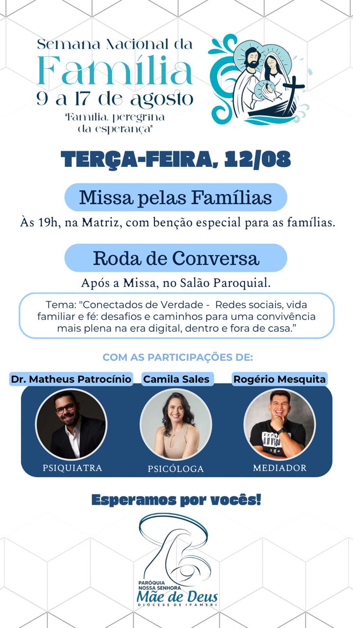 Na última terça-feira (12), após a missa das famílias, ocorreu uma roda de conversa com o tema “Conectados de verdade: redes sociais, vida familiar e fé – desafios e caminhos para uma convivência mais plena na era digital”. O encontro contou com o médico psiquiatra Dr. Matheus Patrocínio, a psicóloga Dra. Camila Salles e mediação de Rogério Mesquita. Enquanto isso, as crianças tiveram um espaço exclusivo com atividades de evangelização.