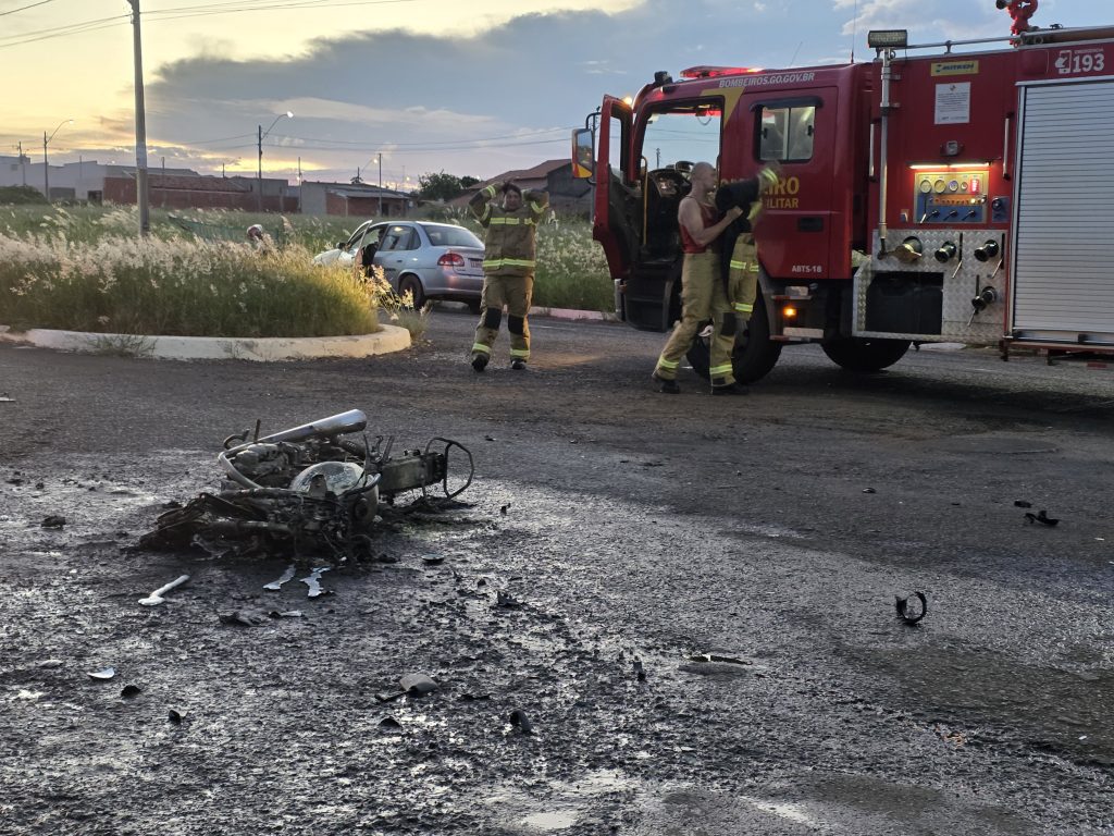 De acordo com as informações apuradas, o carro subia a avenida e, ao realizar uma conversão à esquerda, acabou atingido pelas motocicletas que desciam pela via. Com o impacto, uma das motos pegou fogo e ficou completamente destruída.