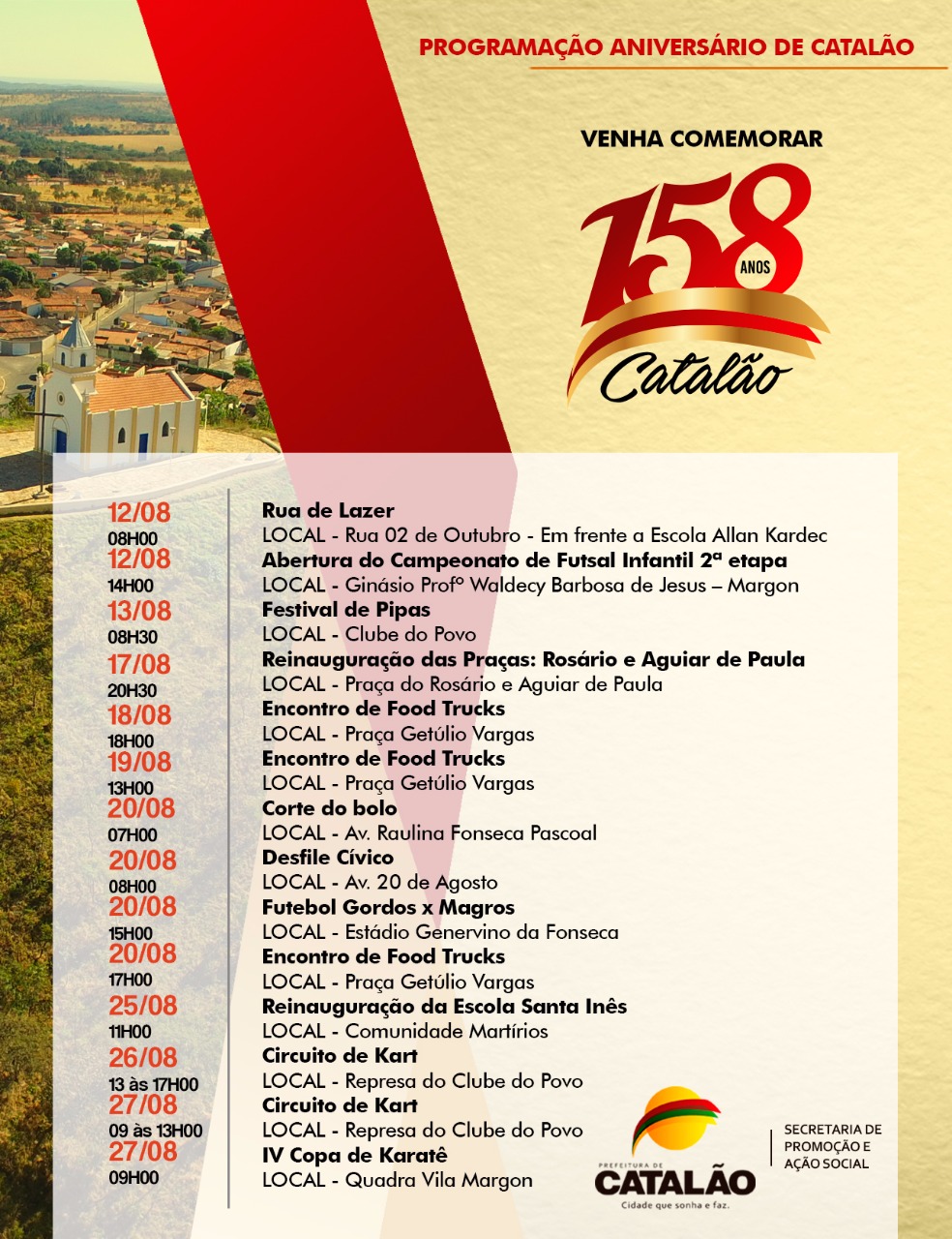 A comunicação da prefeitura de Catalão divulgou a programação completa das comemorações dos 158 anos da cidade. Eventos de várias modalidades esportivas, feiras gastronômicas, tradicional jogo entre gordos e magros no estádio do Crac e o Desfile Cívico, estão inclusos na programação que você na abaixo disponibilizada pela Secretaria Municipal de Comunicação.