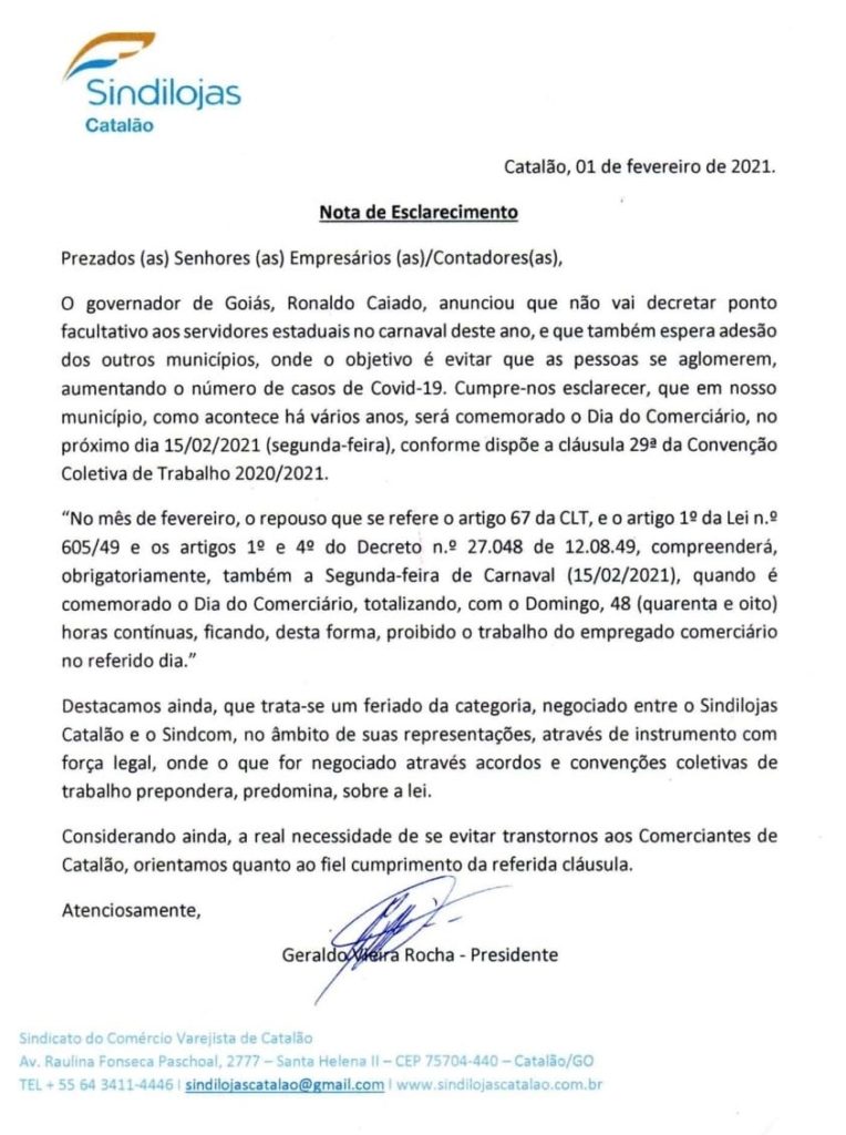 Outro sindicato que representa os trabalhadores comerciários em Catalão, é o Sindicato do Comércio Varejista (Sindilojas), que emitiu um documento seguindo a mesma decisão do Sindicom, que assegura o direito de repouso aos comerciários na cidade no dia 15 de fevereiro, feriado de carnaval, mesmo dia em que é comemorado o dia do comerciário.