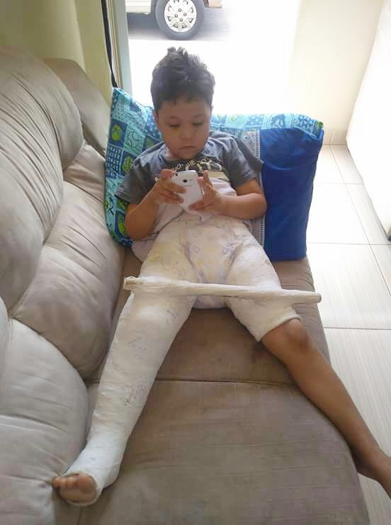 Miguel Vitor, 05 anos de idade, fraturou o fêmur e terá na próxima semana que refazer todo o processo cirúrgico. A criança está da cintura toda imobilizada da cintura para baixo através de um gesso.
