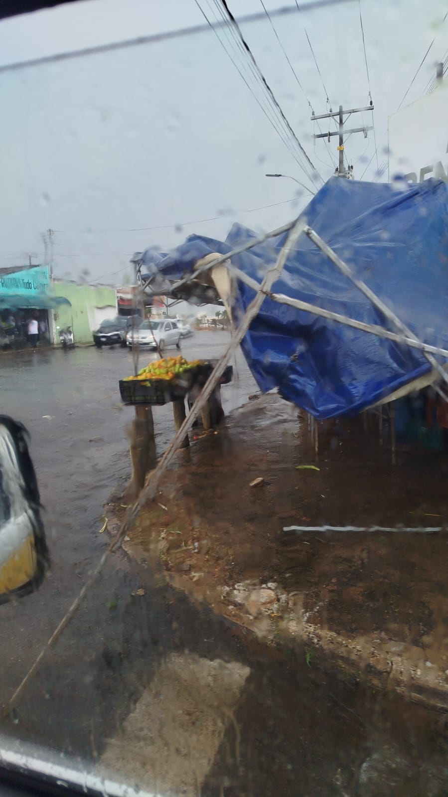 No Bairro das Américas, moradores informaram que o vento arrancou árvores e causou danos. Além disso, uma tenda de um estabelecimento comercial se soltou e foi arrastada pela força da chuva.