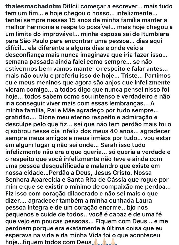 Pouco antes do ocorrido, Thales Machado fez uma publicação em rede social que foi posteriormente removida. No texto, ele indicava que cometeria o ato extremo e mencionava que levaria os filhos “anjinhos” consigo. Além disso, também fez referências à esposa e ao possível fim do relacionamento após 15 anos, demonstrando não aceitar a situação. Ele pediu desculpas a familiares, inclusive ao prefeito, e pediu perdão a Deus.