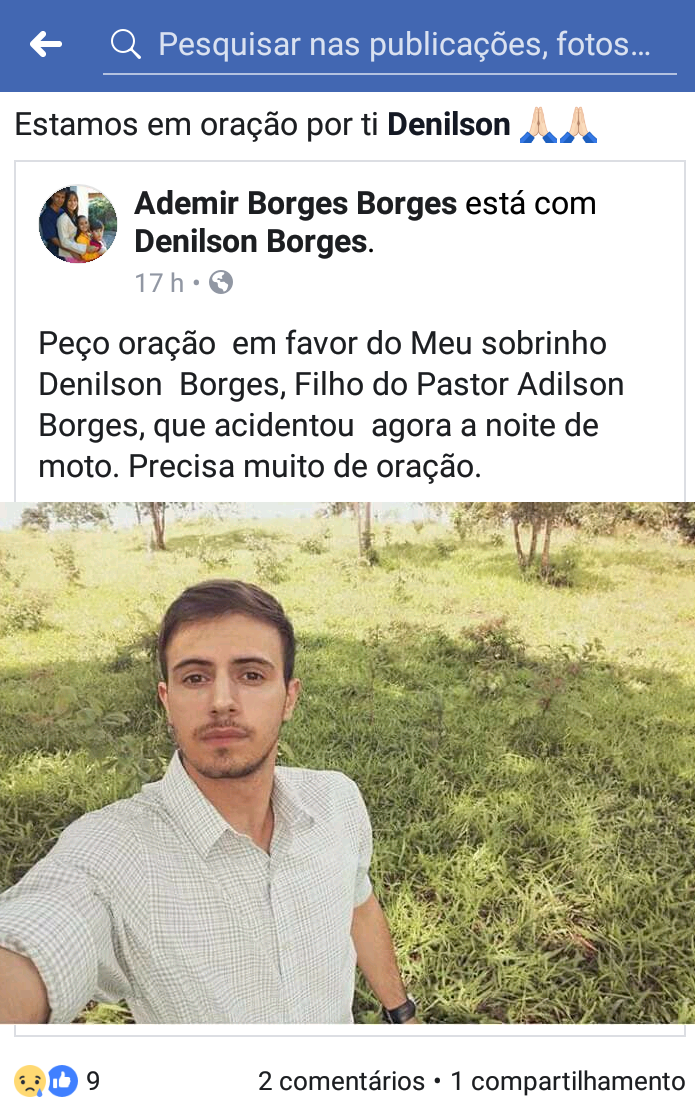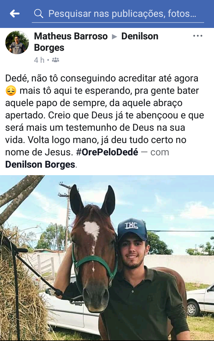 Denilson Borges é filho do casal Viviane e do pastor da igreja evangélica Assembleia de Deus, Adilson Borges. Populares e queridos, milhares de pessoas, entre familiares e amigos, se manifestaram nas redes sociais para pedirem orações pela recuperação do jovem.