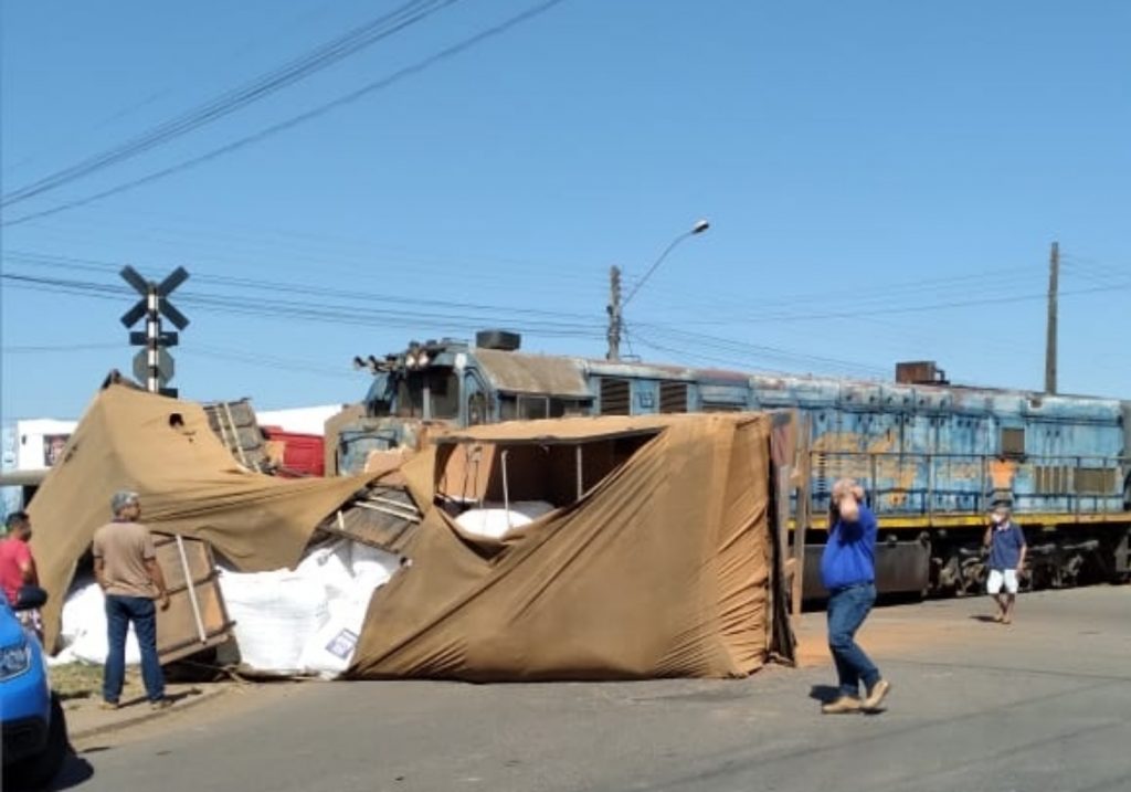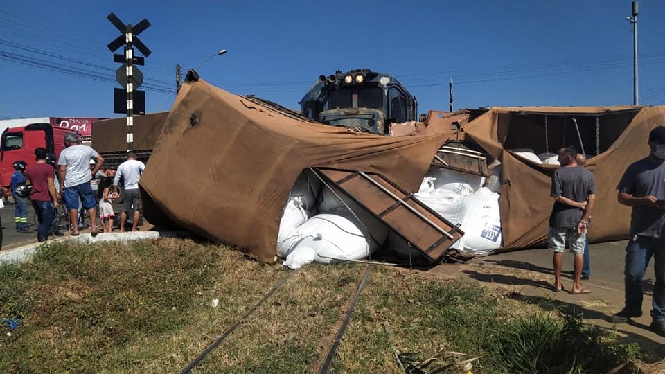 De acordo com informações, o maquinista que conduzia a locomotiva até tentou acionar os freios, mas com a extensão do veículo pesado, não foi possível evitar a colisão, arrastando a carreta por alguns metros e espalhando grande parte da carga pela rua.