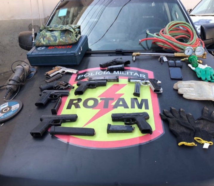 Armas e objetos apreendidos pela ROTAM. Foto: Divulgação da PM/Reprodução