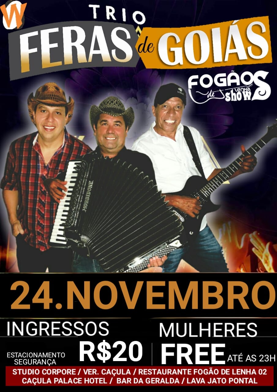 No próximo sábado, 24 de novembro, no Fogão de Lenha Show, você terá uma noite para dançar e se divertir com o TRIO OS FERAS DE GOIÁS”. Só lembrando que a entrada é franca para a mulherada até às 23 horas. Os ingressos serão ao preço de R$ 20 reais.