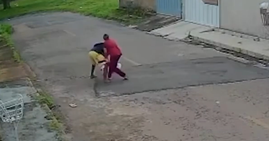Imagens de câmeras de segurança mostram o momento em que a mulher reage ao assalto e briga com o ladrão. Mas, o assaltante chuta o cachorro e a mulher solta o celular.