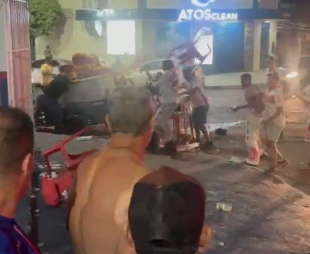 Imagens que circulam nas redes sociais mostram arruaceiros depredando o local e entrando em confronto físico, em um episódio que chocou comerciantes e moradores da cidade. O confronto aconteceu logo após o empate em 2 a 2 entre as equipes, pela terceira rodada da Divisão de Acesso do Campeonato Goiano. Logo depois, alguns deles aparecem filmados sendo acompanhados por policiais.