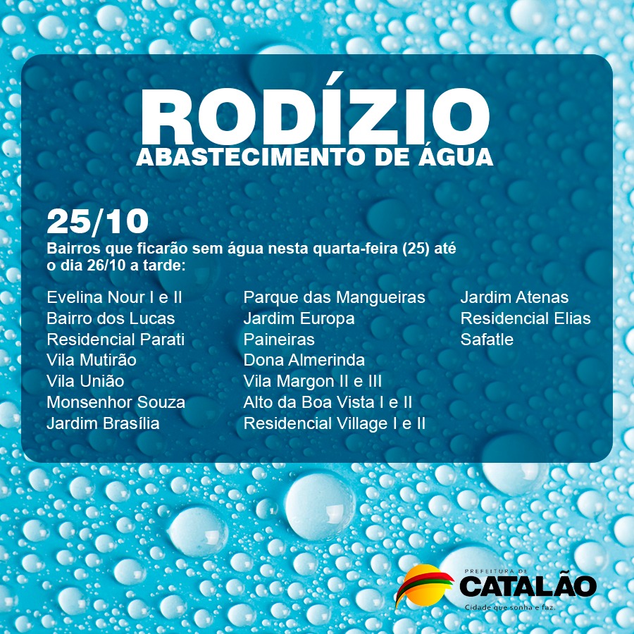 Como anunciado aqui na matéria anterior, publicada agora pouco e que informava que a SAE iniciaria o sistema de rodízio no abastecimento de água da cidade, a comunicação da Prefeitura de Catalão divulgou a lista dos primeiros bairros que ficarão sem água.