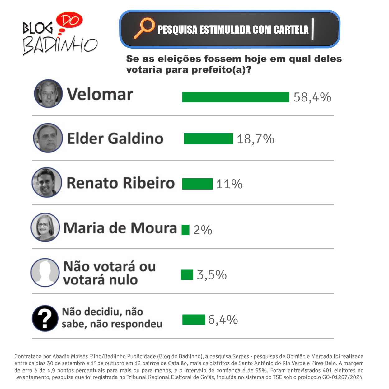 A pesquisa, contratada por Abadio Moisés Filho/Badiinho Publicidade (BLOG DO BADIINHO/CNPJ 24.129.786/0001-00) e realizada entre 30 de setembro e 1º de outubro, ouviu 401 pessoas em 12 bairros de Catalão, além dos distritos de Santo Antônio do Rio Verde e Pires Belo. Com uma margem de erro de 4,9 pontos percentuais para mais ou para menos e com intervalo de confiança de 95%, a pesquisa foi registrada no TRE-GO sob o protocolo GO-01267/2024.