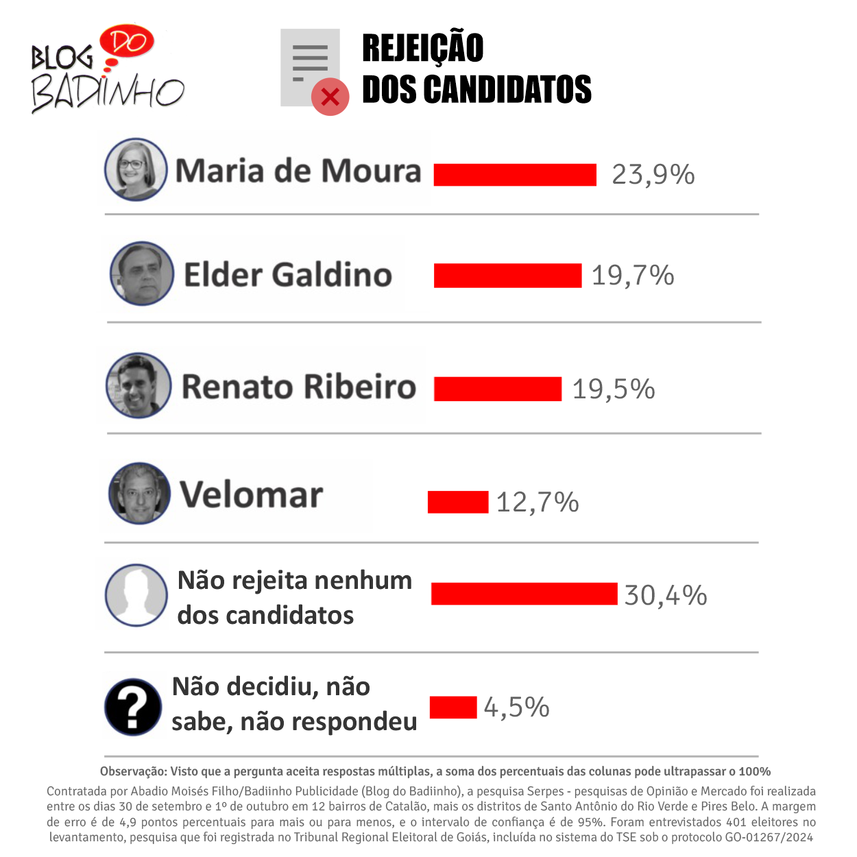 Em relação à rejeição dos candidatos, Maria Moura liderou com 23,9%, seguida de perto por Elder Galdino (19,7%) e Renato Ribeiro (19,5%). Velomar Rios é o candidato com menor rejeição, com 12,7%. Ainda assim, 30,4% dos entrevistados afirmaram não rejeitar nenhum dos candidatos, e 4,5% não responderam.