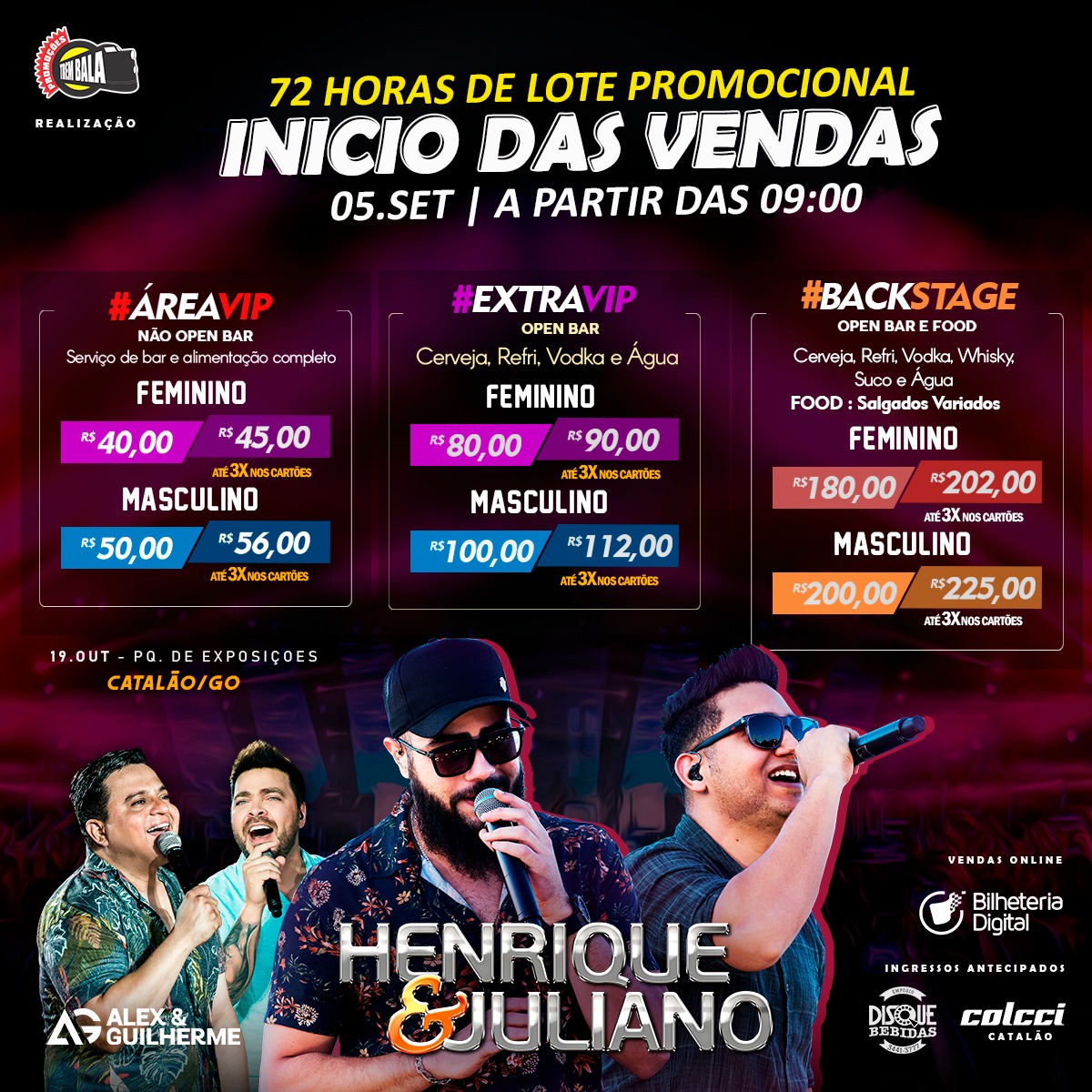 Neste primeiro lote, os preços dos bilhetes terão preços promocionais por 72 horas e estarão disponíveis nos seguintes pontos na cidade de Catalão: Disque Bebidas (AV. Raulina. F. Paschoal) e Loja Colcci (A.20 de agosto). Confiram a tabela com os preços do 1º lote abaixo: