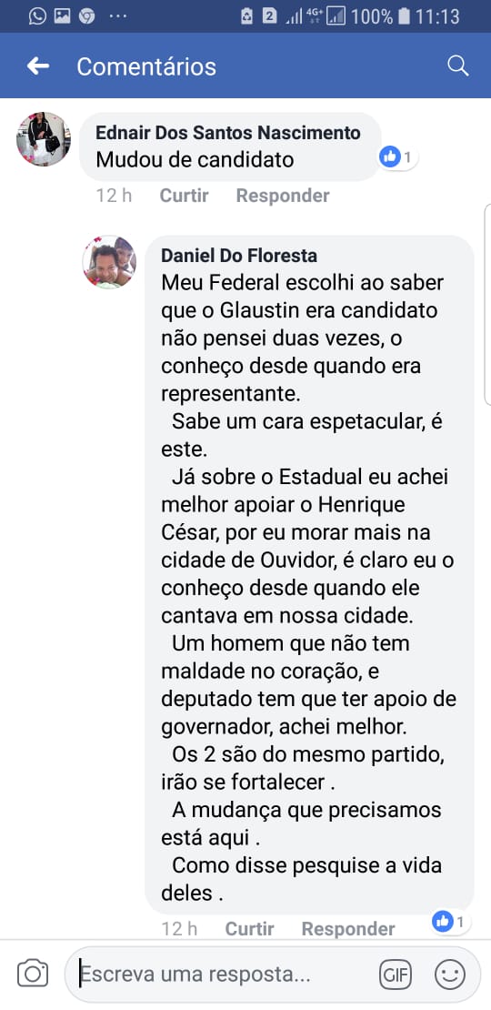 “Meu Federal escolhi ao saber que Glaustin era candidato, não pensei duas vezes, o conheço desde quando era representante. Sabe um cara espetacular? É este. Já sobre o Estadual, eu achei melhor apoiar o Henrique César, por eu morar mais na cidade de Ouvidor, e claro, eu o conheço desde quando ele cantava em nossa cidade. Um homem que não tem maldade no coração, e deputado tem que ter apoio de Governador, achei melhor. A mudança que precisamos está aqui, como eu disse, pesquise a vida deles”, essas foram as justificativas de Daniel do Floresta ao justificar a troca de seu colega de parlamento, Deusmar por Henrique César (PSC) e Glaustin da Foccus.