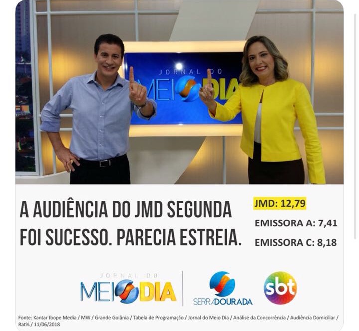 Apresentado pelos jornalistas Jordevá Rosa e Luciana Finholdt, o Jornal do Meio Dia ficou com 12,79 pontos de audiência, enquanto o segundo lugar ficou na marca dos 7 pontos. “A audiência do JMD segunda foi sucesso. Parecia estreia”, diz um folder divulgado nas redes sociais destacando os números positivos do telejornal da afiliada do SBT no Estado.
